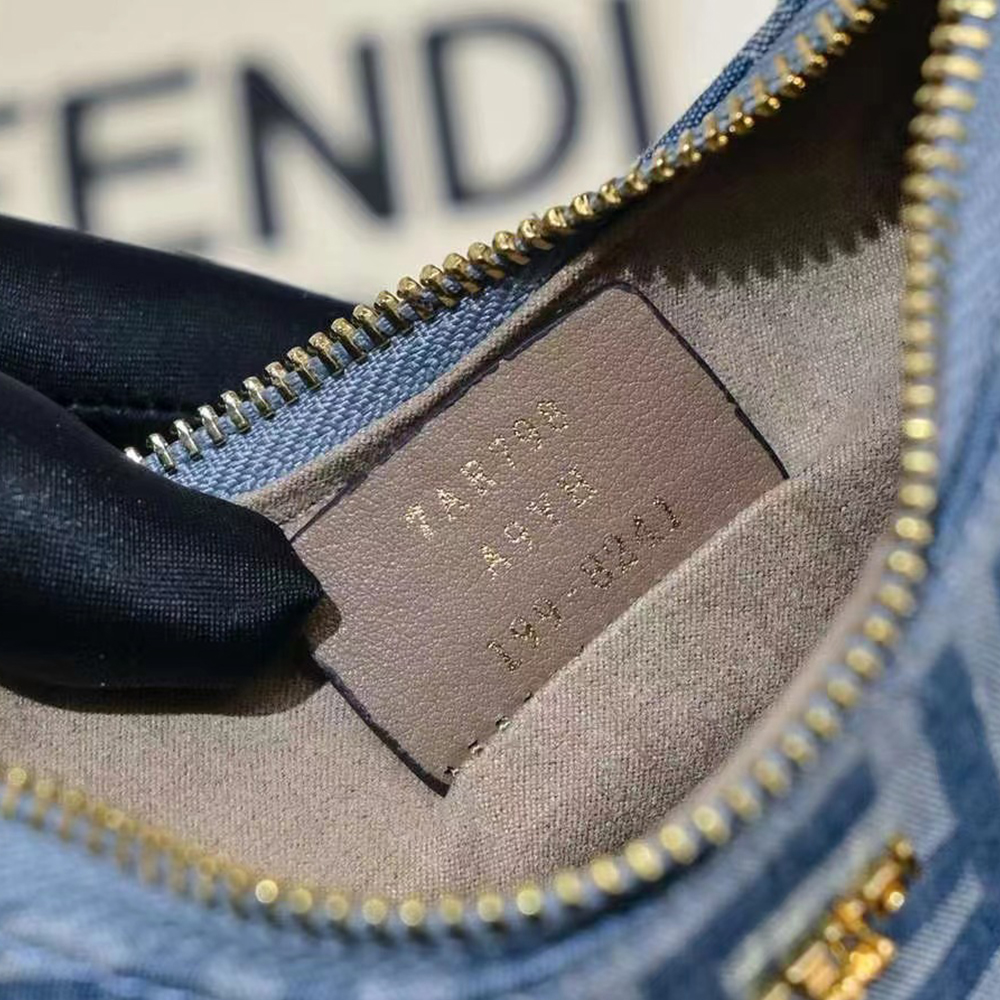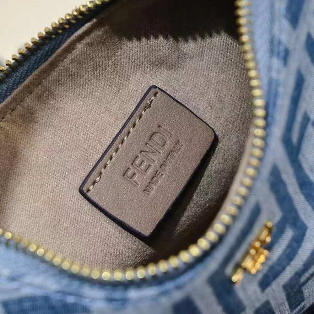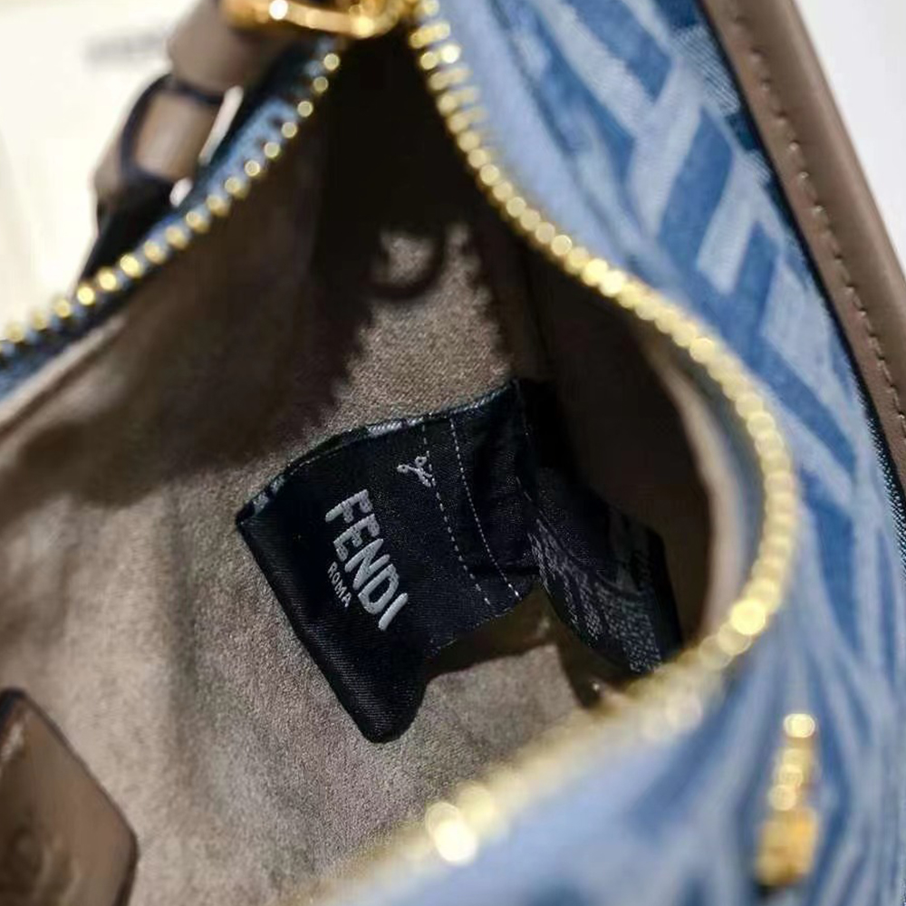Compact yet spacious Fendessence hobo bag in denim-style light blue fabric with FF motif. Trimmed with beige leather. Zip closure with long. knotted leather pull.Featuring lined compartments. metal Fendi lettering and gold-finish hardware.Can be carried by hand or tucked under the arm.